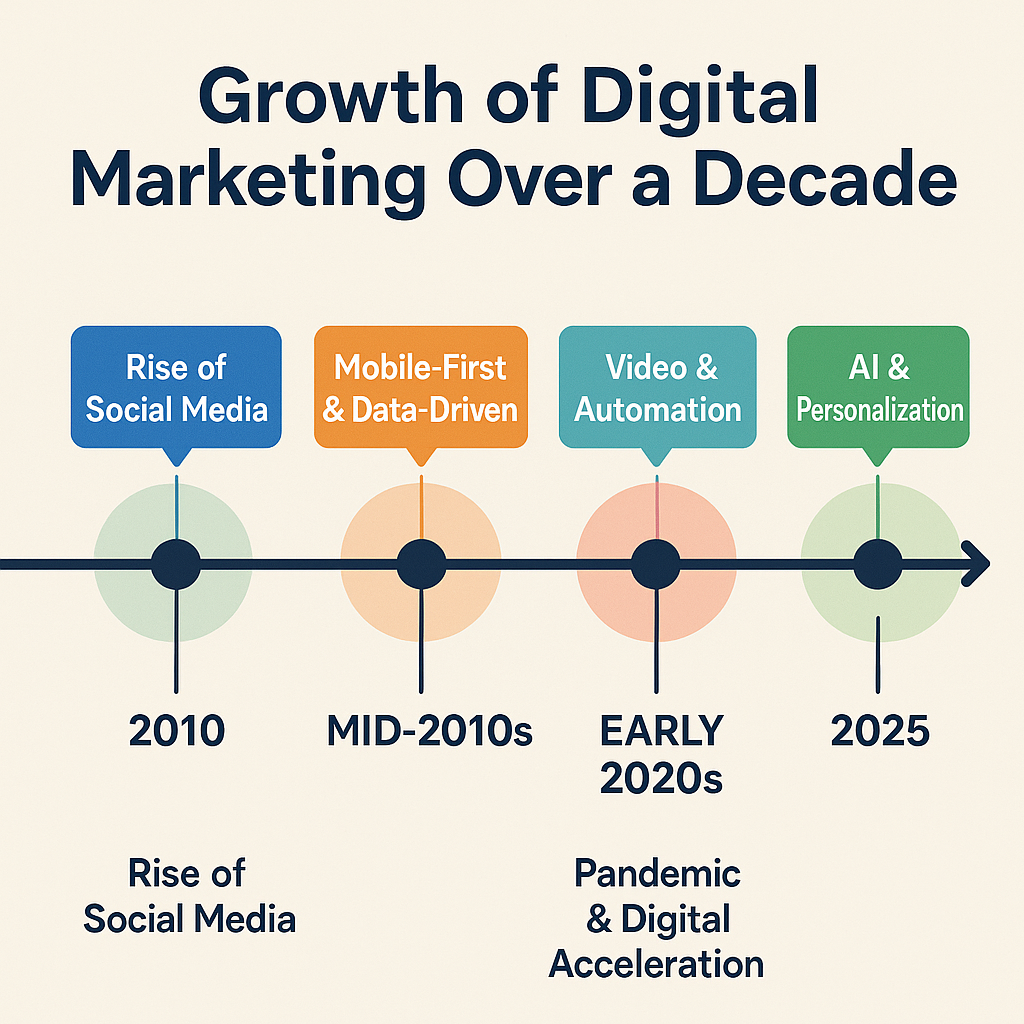 Over the past decade, digital marketing has evolved from a niche concept into one of the most critical pillars of business strategy. It has fundamentally changed the way brands connect with customers, how campaigns are created, and even how success is measured. Let’s take a closer look at this fascinating journey of growth and innovation.